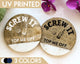 - Unlike other sellers, we print the designs onto the coasters with UV technology, meaning we can print on both the white and the wood.